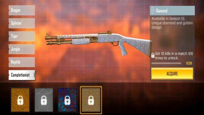 Szerezz 10 ölést meccsenként 120 meccsen (1200 ölés), hogy feloldd a Diamond Camo-t minden Shotgun-hoz.