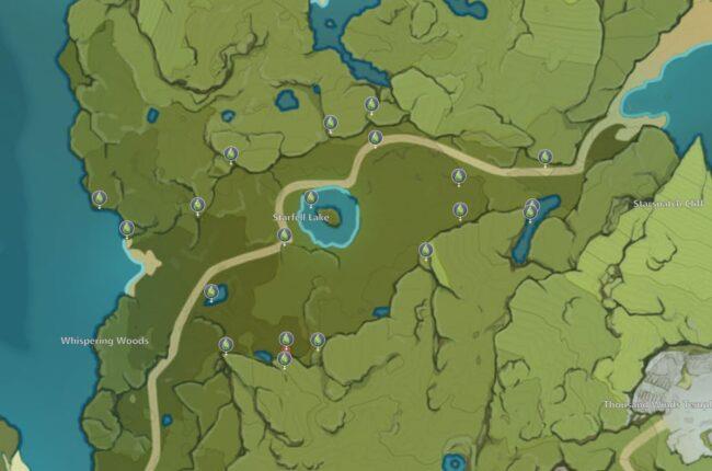 A busca do Path of Gentle Breezes de Moonchase Charms levará os jogadores para a área ao redor do Starfell Lake. No mapa acima, Genshin Impact, você encontrará todos os vinte locais de Moonchase Charms.