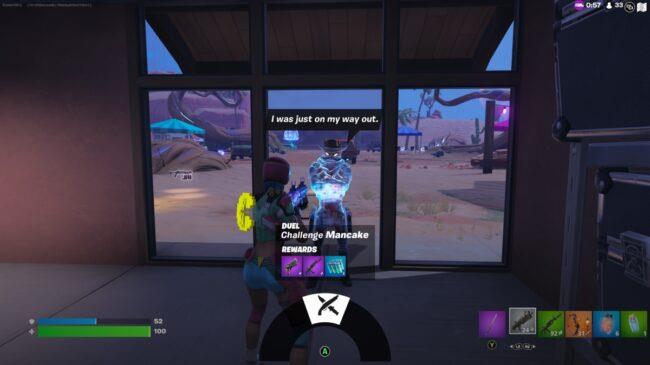Der nächste NPC, den Sie finden und zu einem Duell herausfordern müssen, ist Mannkuchen. Dieser Cowboy ist bei Rocky Reels zu finden und bietet 2 epische Raritätswaffen und Chug Splash, wenn er besiegt wird.